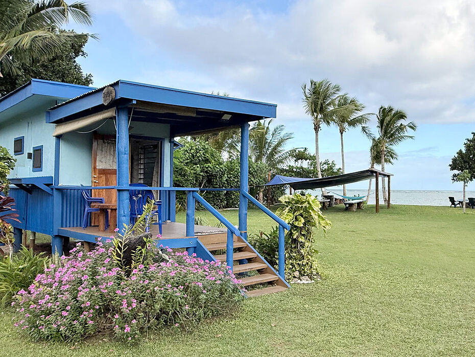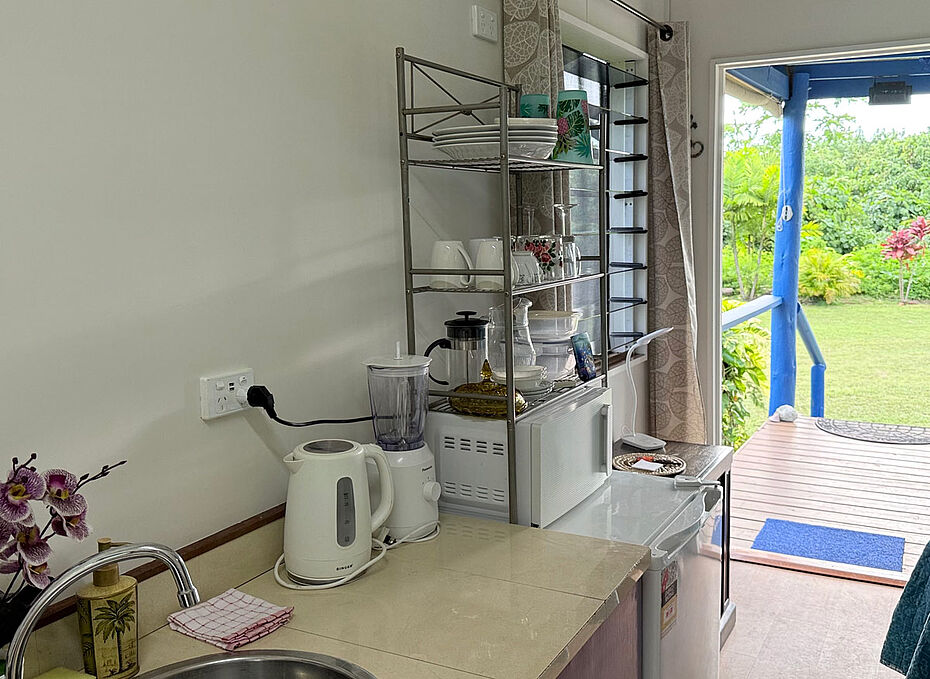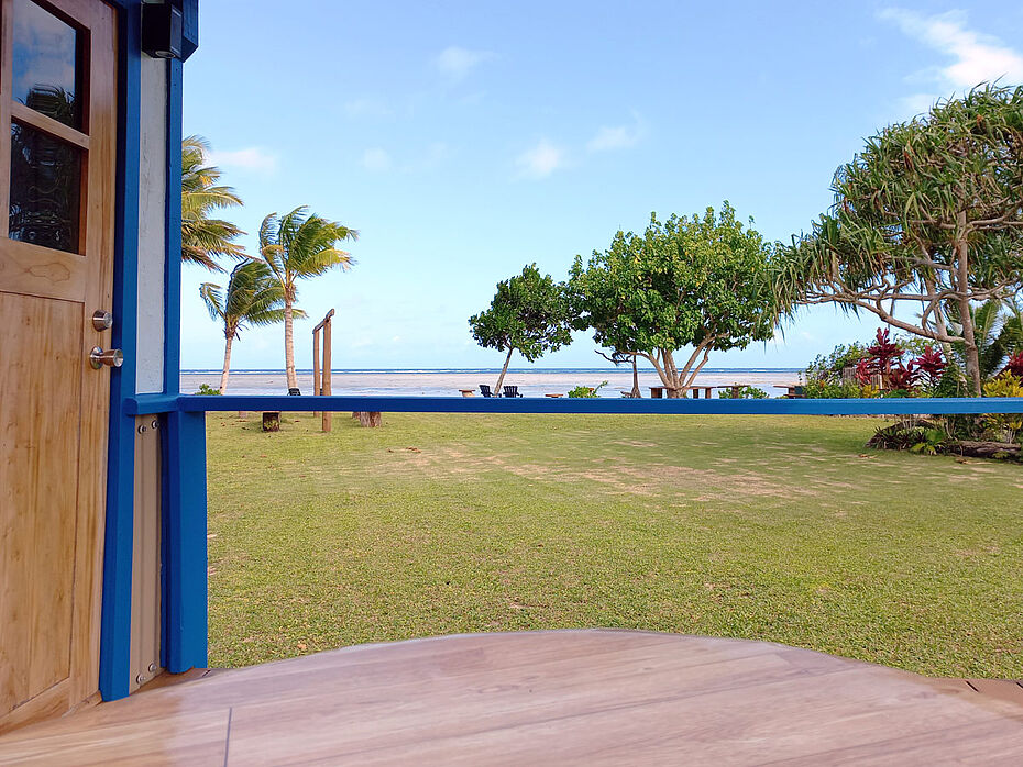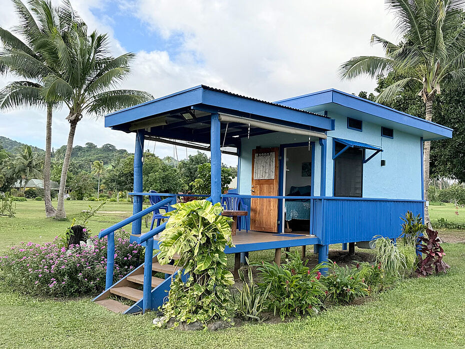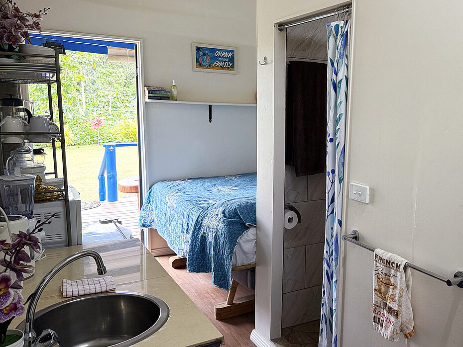 This charming (and very small) bungalow is the closest accommodation to the beach at Sigasiga Sands— perfect for those who want to stay steps from the shore. Though compact, the cozy room features a double-size foam mattress bed and a well-supplied kitchenette for preparing simple meals. The bathroom includes a toilet, vanity, and a separate large walk-in shower, with an additional outdoor shower nearby for rinsing off after a swim or snorkel. The covered deck, complete with roll-up shades with 80% shade and wind protection and offers a stunning ocean view — an ideal spot to relax and enjoy the tropical breeze. There are raintree slice varnished tables and chairs with a large canopy offering all Guests beachside lounge comfort.