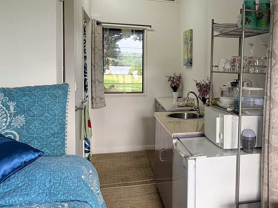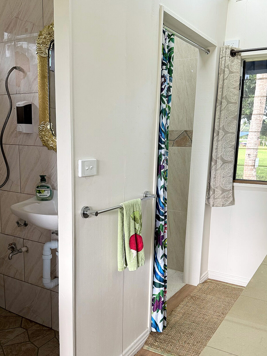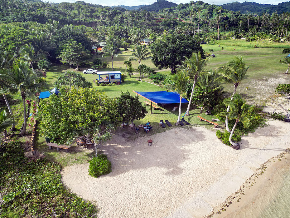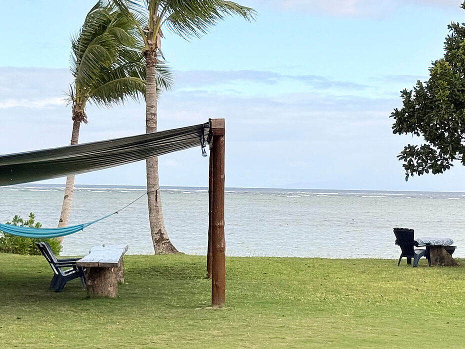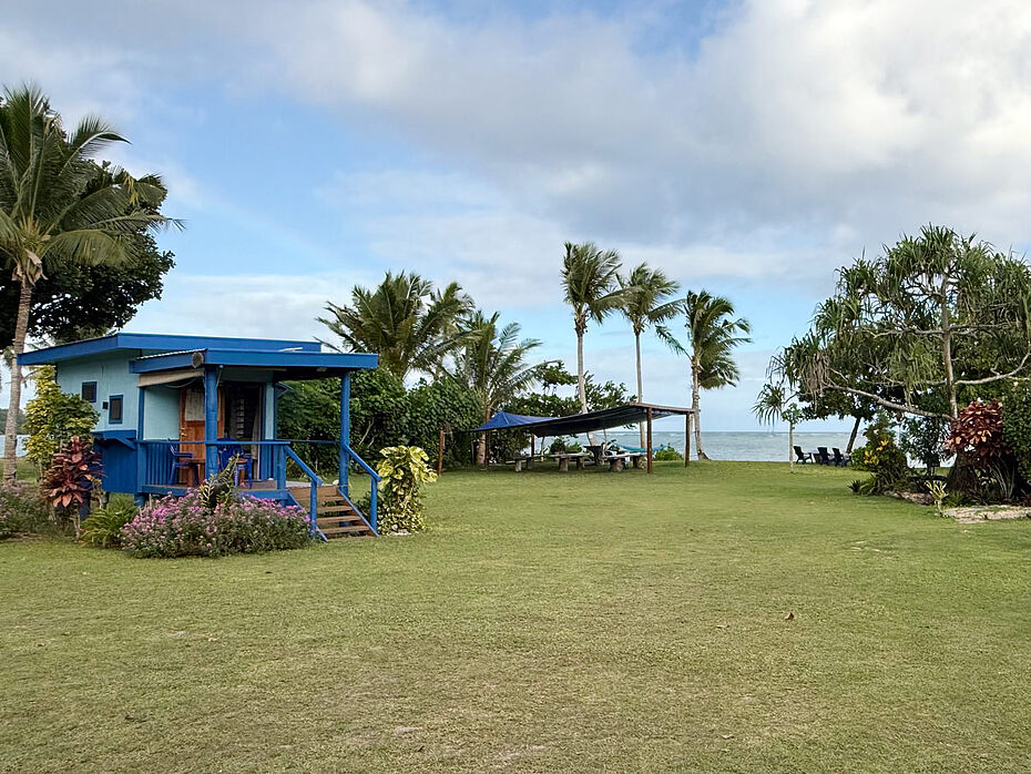 This charming (and very small) bungalow is the closest accommodation to the beach at Sigasiga Sands— perfect for those who want to stay steps from the shore. Though compact, the cozy room features a double-size foam mattress bed and a well-supplied kitchenette for preparing simple meals. The bathroom includes a toilet, vanity, and a separate large walk-in shower, with an additional outdoor shower nearby for rinsing off after a swim or snorkel. The covered deck, complete with roll-up shades with 80% shade and wind protection and offers a stunning ocean view — an ideal spot to relax and enjoy the tropical breeze. There are raintree slice varnished tables and chairs with a large canopy offering all Guests beachside lounge comfort.